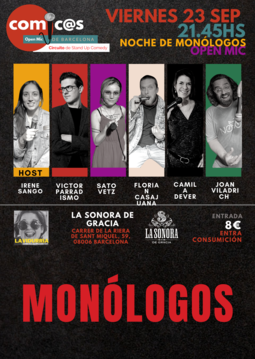 ¿Sabes lo que es un open mic de comedia? Comic@s que viene a probar sus textos de comedia para hacerte reír... Pero ey! Cuidado con las expectativas!!!! igual como puedes reír, puedes llorar o puedes ofenderte o puedes gozar... Pero lo que si es seguro que es la pasarás muy bien viernes a viernes con cómic@s diferentes que vienen con ilusión a mostrarte en pocos minutos sus trabajos humorísticos... ¿Te animas a vivir esta experiencia humorística con nosotros? Pues te esperamos para darlo todo para ti...